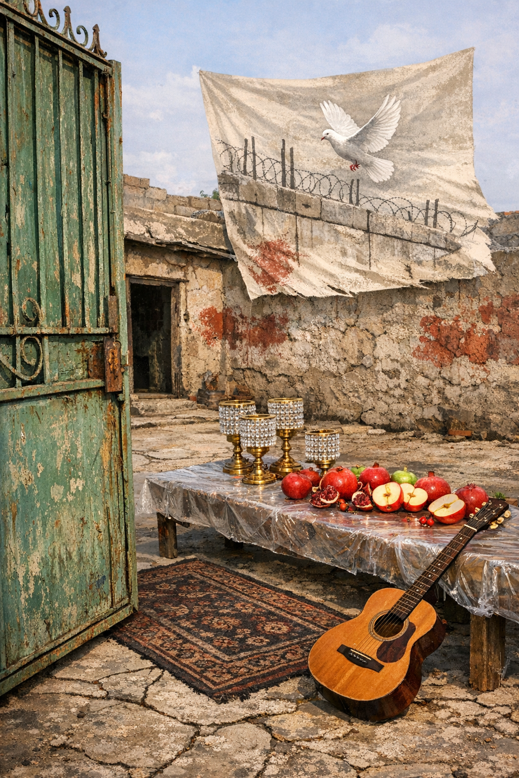 ואני רצה בין הסמטאות מחפשת ומרגישה בעוצמת הגלות. צלילי מואזין נוגים מעצימים את הבדידות ומשהו חם ממלא לפתע את עיני, דומע ריחוק, כוסף לחיבור, חש חורבן. ופתאום אני רואה אותה, את החומה הזו. בקרן זווית ברחוב צדדי, מתוחה על דף מתנודד ברוח, מצוירת מוטות ברזל, מרוססת אדום. לב קרוע ניצב בצידה האחד ויונה נושאת כנף מן העבר השני וזעקה גם עולה ממנה, מכריזה בכתב רועד, באותיות עזות 'גלות הנפש'.