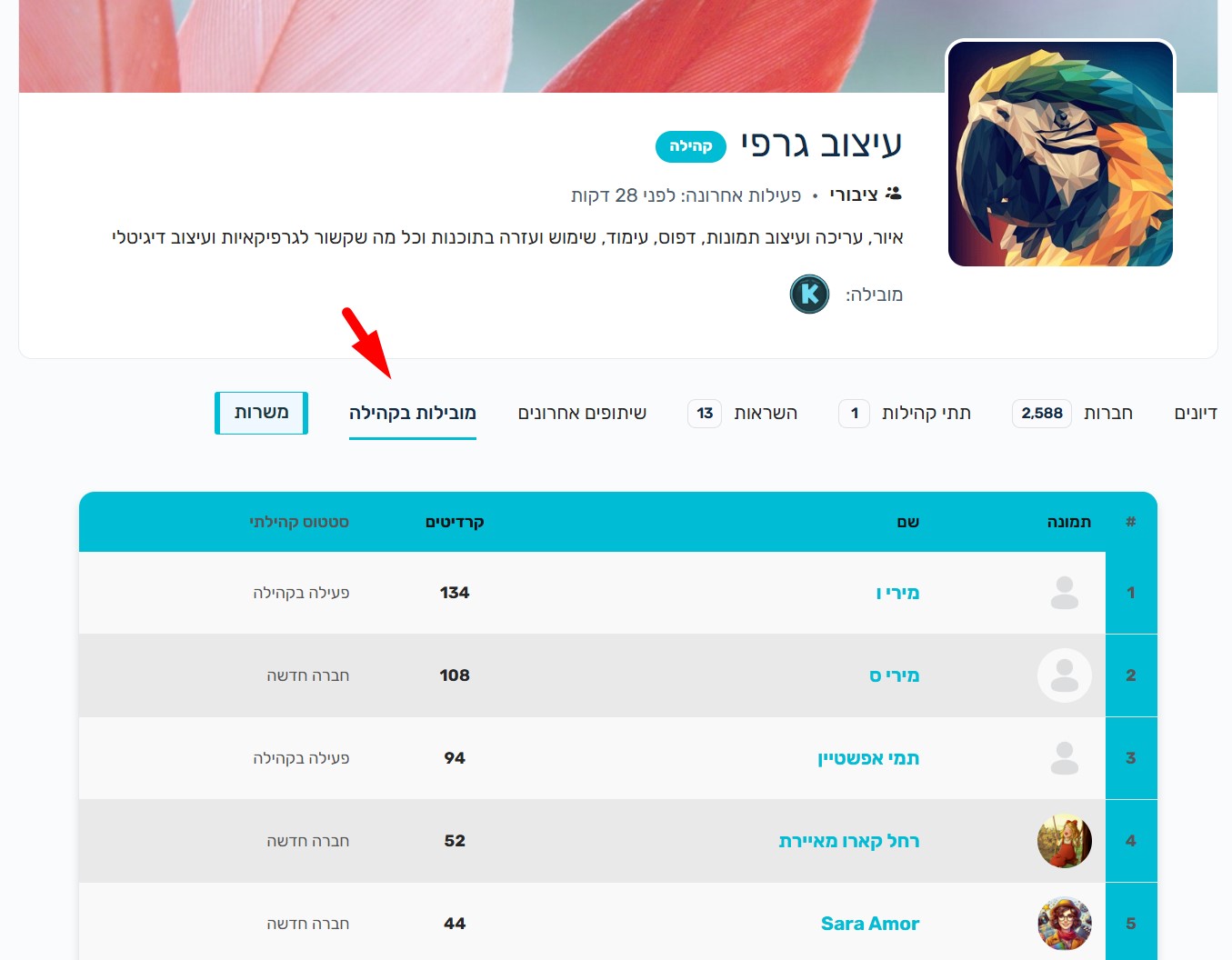 מדרג אותך בלוח "מובילות בעזרה בקהילה" המופיע בכל קהילה.