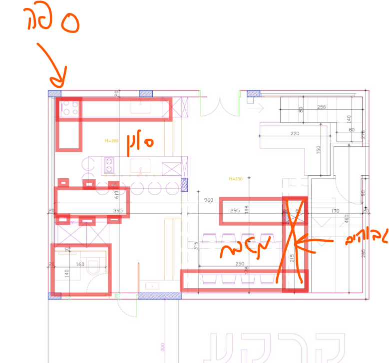 2. לגבי תכנית ההנמכות- אני חשבתי לוותר על תאורה ישירה בתקרה הנמוכה גם בגלל ההרגשה וגם כדי למנוע חציבות מיותרות ולפזר תאורה רק בגבס(ספוטים וכו') חוץ מהפינת אוכל