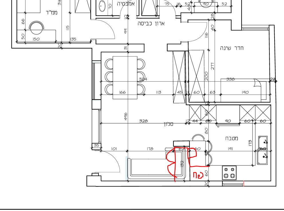 כך שהמטבח יוגדל ע"ח הסלון.הארונות עליונים/ הקלאפה אמורים להיות מעל הכיורים.