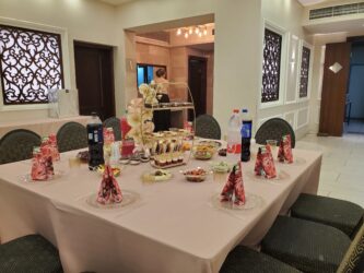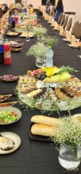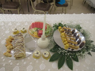 שבכל שולחן : מרכז שולחן , כלי לבר קטן למתוקים וכלי מענין למנה חמה מרכזית.
