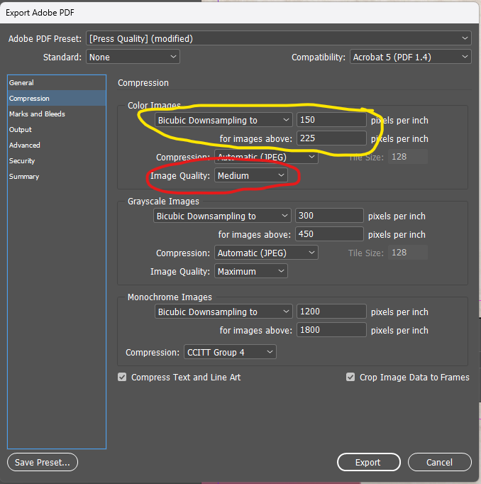 אבל זה פשוט ממש:בחלון > EXPORT PDF> Compression> Color images