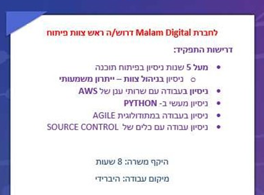 לחברת מלם דיגיטל דרושה ראש צוות פיתוח