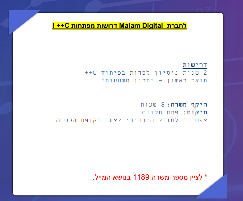 לחברת מלם דיגיטל דרושות מפתחות ++C!