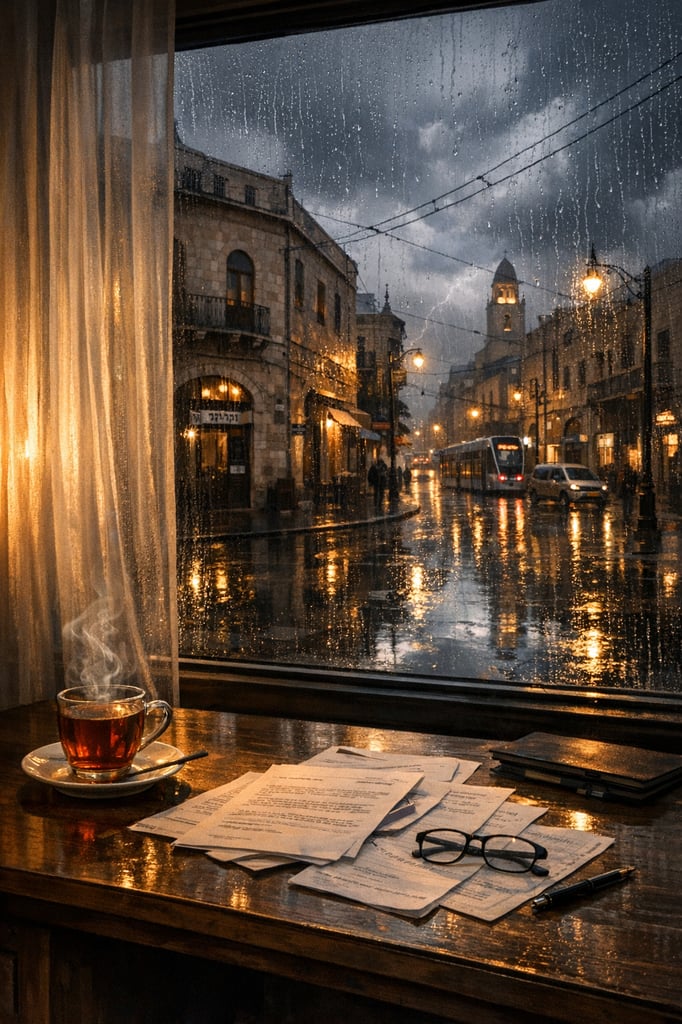 גשם ירושלמי כבד מלווה יום סוער במיוחד במשרד קטן, בו נחשפות לאט לאט סדקים דקים בנפשות הנשים העובדות בו. תיקיה שנשלחת בטעות חושפת מציאות שאיש לא שיער, ומאחורי חיוכים מנומסים מסתתרות סערות עזות. בין מילות שיגרה ועוגיות שוקו, מתפוגגות המסכות.