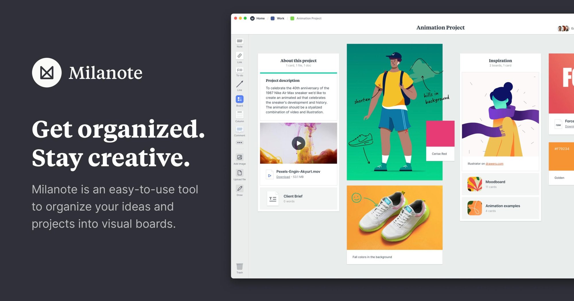 Milanote is an easy-to-use tool to organize your ideas and projects into visual boards. Add notes, images, links and files, organize them visually and share them with your team.