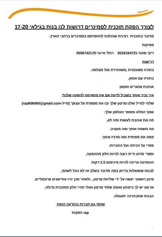בא לך להשתתף בתוכנית הבאה? (מתאים לבנות 17-20)