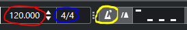 ראי צילום מסך: בכחול- הטמפו כרגע. באדום- המשקל, בצהוב- סמל המטרונום.המטרונום פועם לפי ה-BPM שהכנסת. ככל שהערך גבוה כך הקצב מהיר יותר.